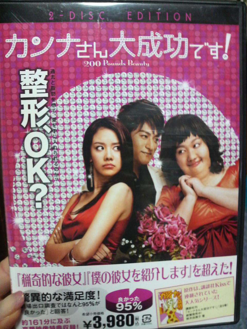 先日、知り合いの方が、面白いよって貸してくださった韓国映画DVD『カンナさん大成功です!』 日本の漫画 鈴木由美子著『カンナさん大成功です』を韓国で映画化されたものらしいです。 写真に写っている二人の女性・・・実は同一人物なんですよ 信じられないくらいの特殊メイクで・・・本当にすごいっ この映画、コメディーなんですけど、最後はかなり感動するんです この映画の主人公の女性は、女優さんなんですけど、この映画の為にすごいボイスレッスンをして・・・実際映画の中で沢山歌っているのですが、これがまた とっても上手なんです かなり気に入っちゃいました そんな訳で・・・ちょっとお勧めです