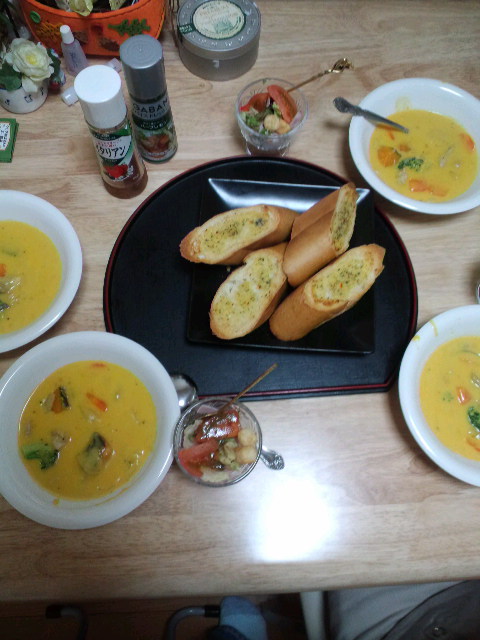 かぼちゃのシチューにガーリックトーストとサラダ